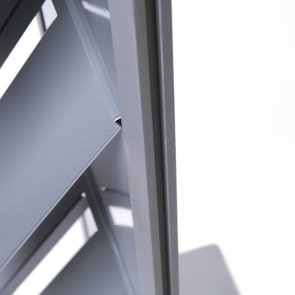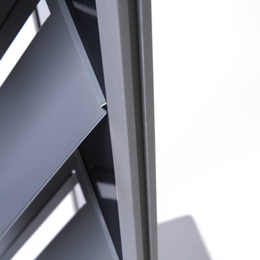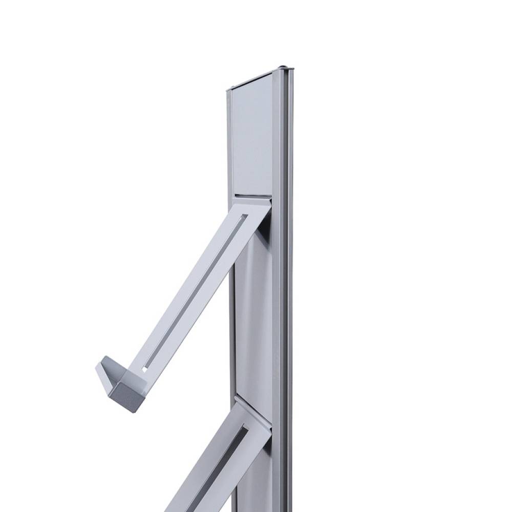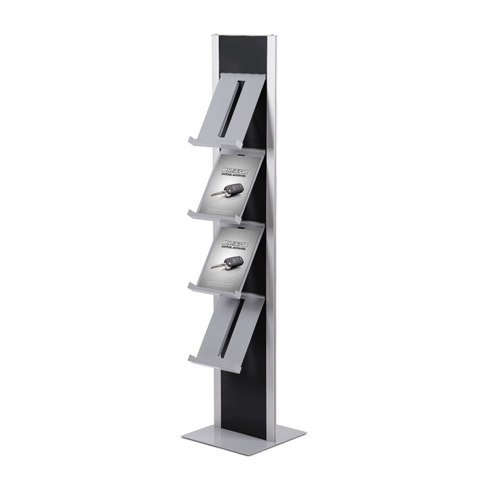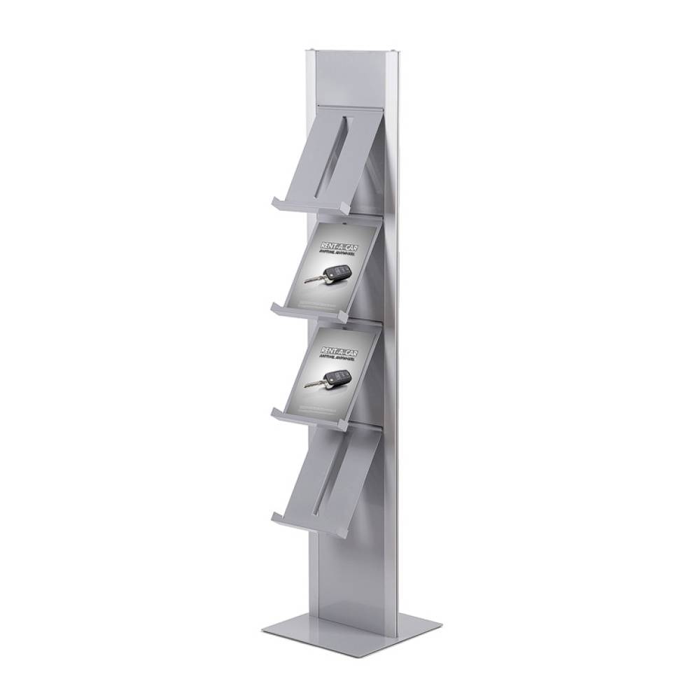 Einseitig nutzbarer silber eloxierter Aluminium-Prospektständer in grau/silber ist mit 4x DIN A4 Prospektablagen bestückt. Einfach zu installieren und zu benutzen. Modular individueller zur doppelseitigen Nutzung erweiterbar. Diese können separat bestellt werden.
