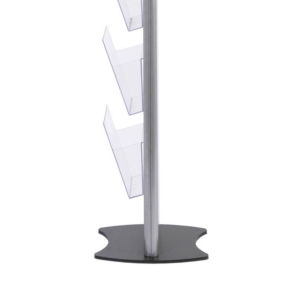 Prospektständer TORRE. Elegante Metallkonstruktion in silber metallic mit einer pulverbeschichteteten Bodenplatte in schwarz. Einzeln verpackt im Versandkarton. Der Ständer besticht durch seine variablen Einsatzmöglichkeiten und sein modernes Design. Mit 12 Stück DIN A4 Prospektdispensern (Art. 19005) Außenmaß: 290 x 1760 x 350 mm.